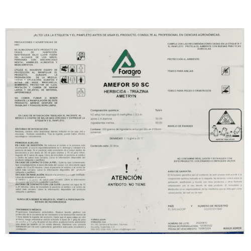 - Descripción General:Amefor 50 SC (ametrina 50%) inhibe el fotosistema II, controlando malezas anuales en cultivos de caña de azúcar y maíz. Se puede aplicar en pre y postemergencia temprana. Composición: