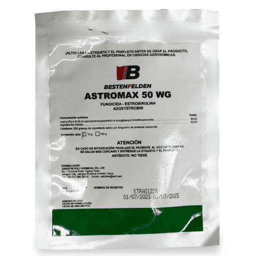 - Descripción General:Astromax 50 WG es un fungicida sistémico a base de azoxystrobin, reconocido por su efectividad contra mildius, tizón temprano, antracnosis y otras enfermedades en papa, tomate y frijol. Composición: