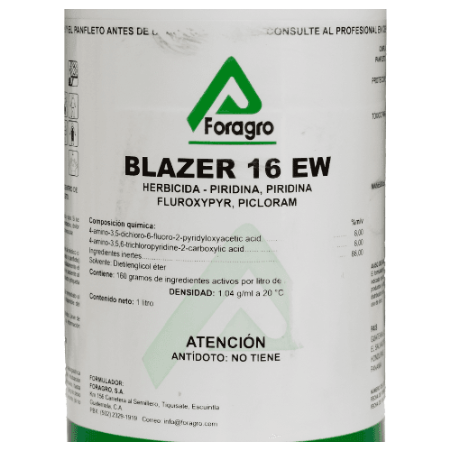 - Descripción General:Blazer 16 EW combina dos herbicidas auxínicos (fluroxypir y picloram) que desregulan el crecimiento de malezas de hoja ancha, especialmente en pastos y cereales. Composición: