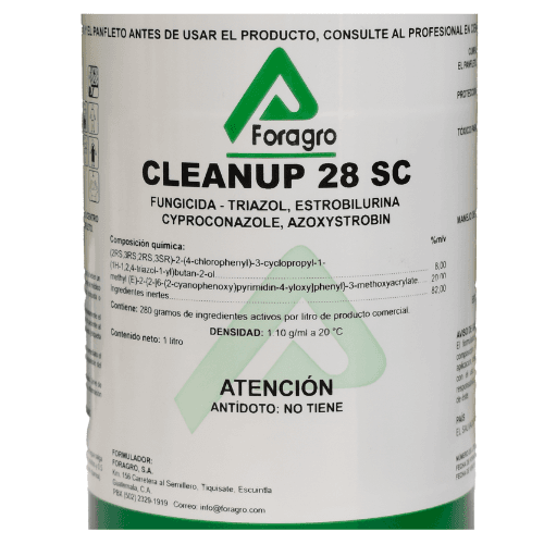 - Descripción General:CleanUp 28 SC combina cyproconazole y azoxystrobin, protegiendo cultivos como café (roya, antracnosis), tomate y chile de mancha de hierro, cercospora y otras enfermedades fúngicas. Composición: