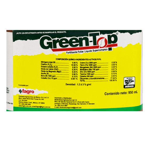 - Descripción General:Greentop es un fertilizante líquido que aporta NPK, micronutrientes y vitaminas esenciales para fortalecer la estructura de la planta y sostener altos rendimientos en diversos cultivos. Composición: