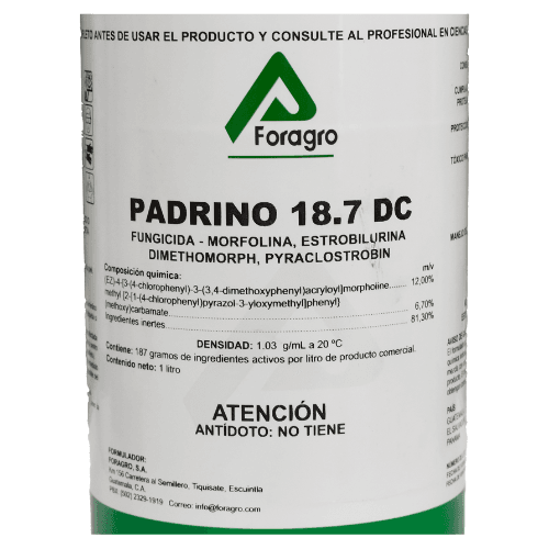 - Descripción General:Padrino 18.7 DC combina dimethomorph y pyraclostrobin, protegiendo cucurbitáceas (melón, sandía, pepino) del mildiu velloso y fusarium, así como papa del tizón tardío. Ofrece una acción sistémica y de contacto. Composición: