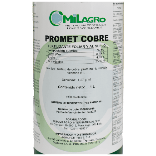- Resumen breve:PROMET COBRE – Fertilizante foliar con alto contenido de cobre y nitrógeno para mejorar el desarrollo y nutrición de las plantas.