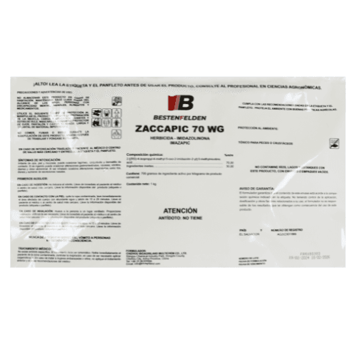 - Descripción General:Zaccapic 70 WG (imazapic 70%) es un inhibidor de ALS selectivo para cultivos específicos como arroz Clearfield, controlando gramíneas y algunas hoja ancha sin dañar la siembra.