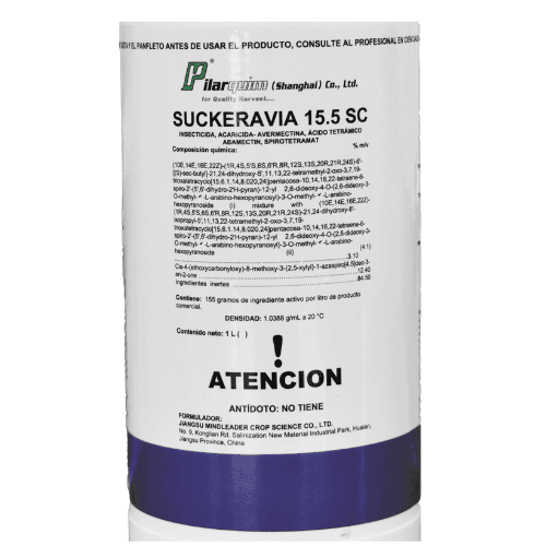 - Resumen breve:Zuckeravia 15.5 SC es un insecticida-acaricida de amplio espectro, formulado con Abamectina y Spirotetramat, que actúa por contacto e ingestión, proporcionando un control eficaz de ácaros e insectos.